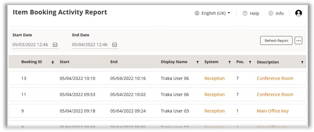 Whilst the Booking Summary page will show all active and future bookings, a separate audit trail will be made available in the reports section of TrakaWEB. There are 2 types of Booking report available; Item Booking Activity Report and Item Booking Exception Report.