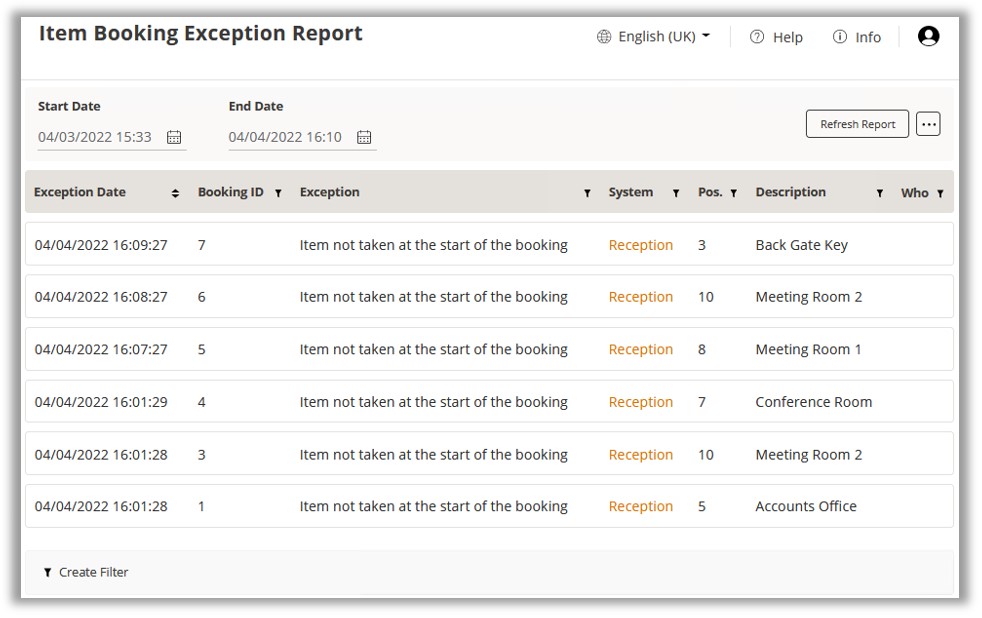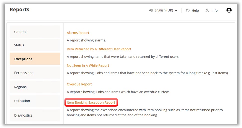 name and you will be taken to the ‘Item Booking Exception Report’.